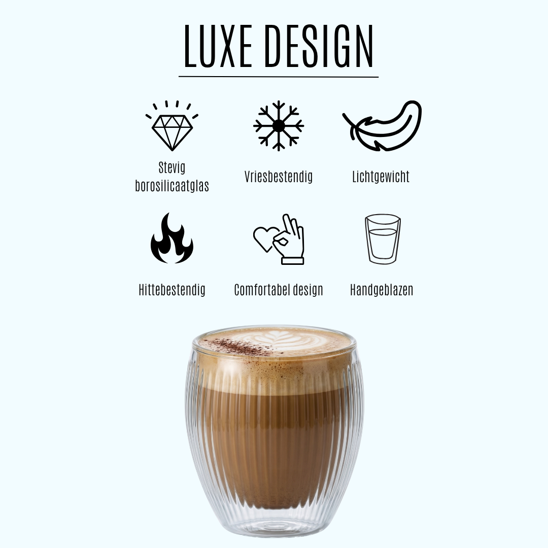 De dubbelwandige glazen zijn echt een gamechanger! Geen warme handen meer en mijn koffie blijft langer op temperatuur. Erg tevreden.